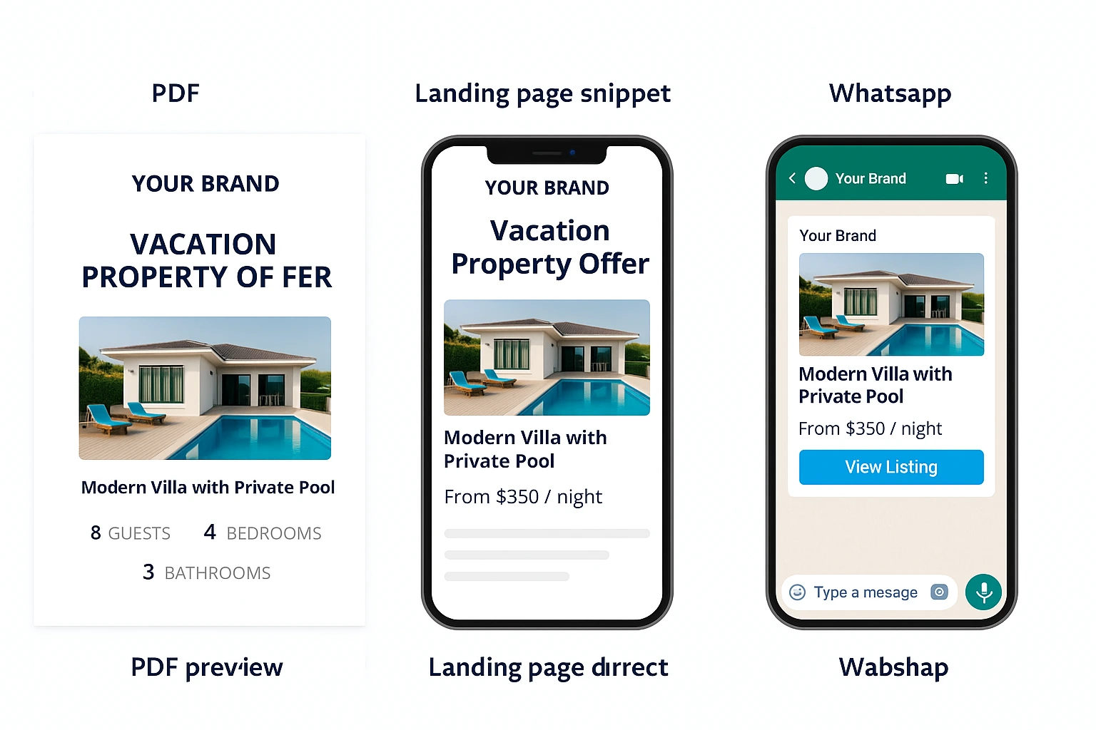 Create offers in one click. Export as PDF, landing page, or WhatsApp message — with your branding or neutral style.