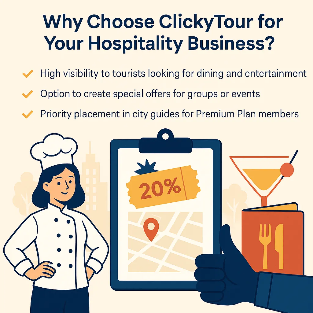 From fine dining to local bars, ClickyTour connects your hospitality service with tourists, locals, and agents ready to book.